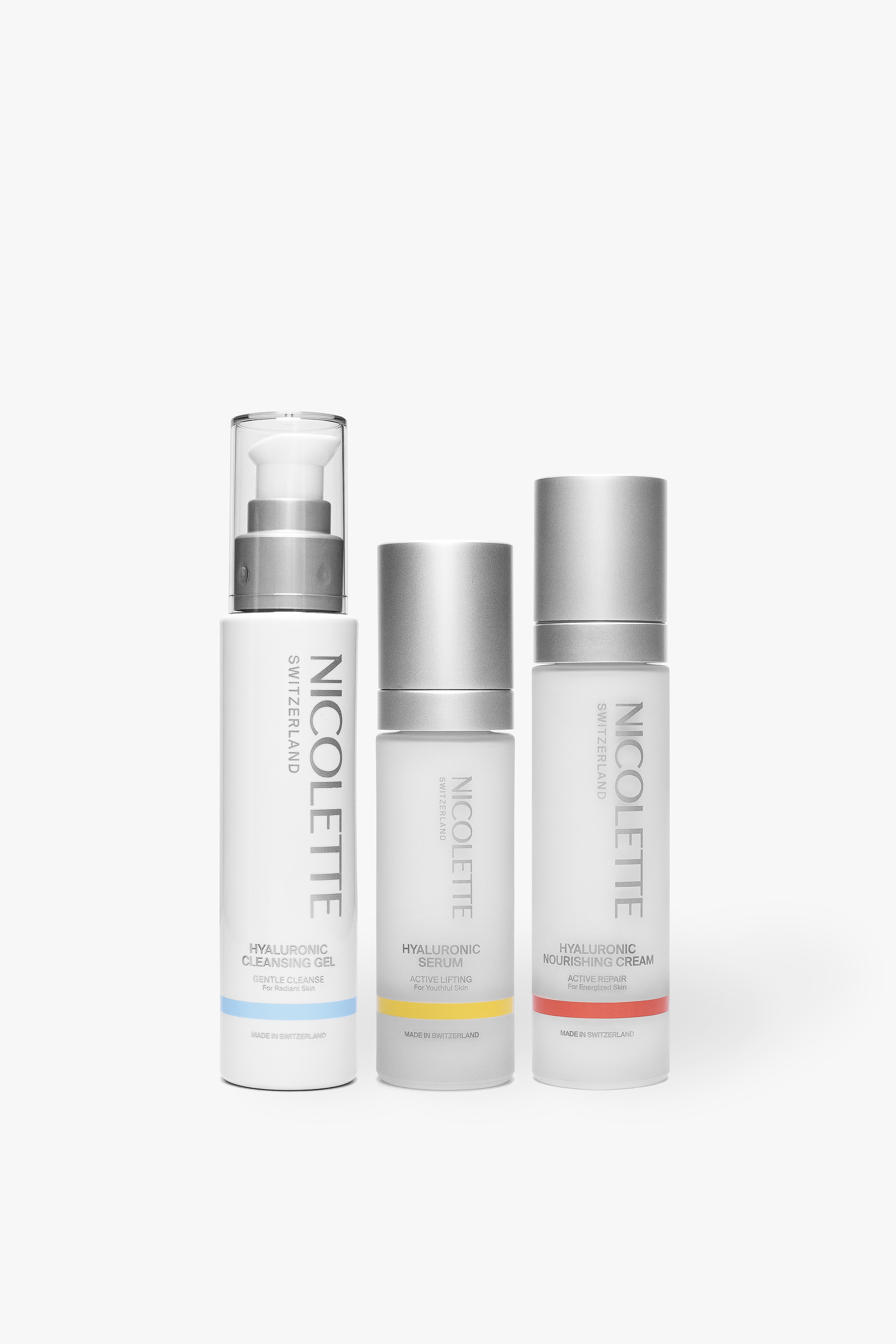 Hyaluronic Serum: High-dose, low-molecular hyaluronic acid; Butterfly bush extract (Buddleja davidii) from the Swiss Alps; Plant glycogen; Polysaccharides from biotechnologically obtained microalgae (Nannochloropsis Oculata); Fermented wheat bran from by-products of the food industry (upcycling)